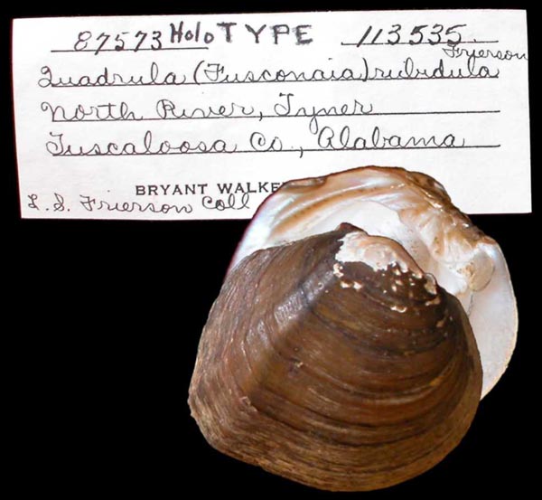Bivalvia | ... | Unionoidea | Unionidae | Ambleminae | Pleurobemini | Fusconaia cerina nominal species Quadrula rubidula Frierson, 1905  Frierson, 1905. Nautilus 19(2): 14, pl. 1, figs. 3-4. Type(s): HOLOTYPE UMMZ_113535, North River, Tyner, Tuscaloosa Co., Alabama.