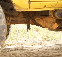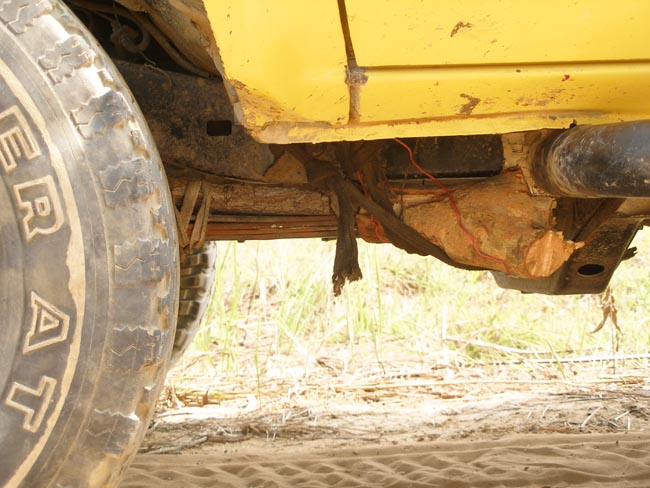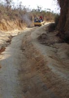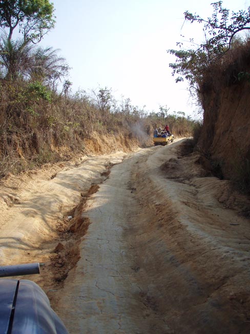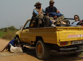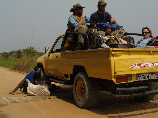 When we weren't in the city, the tracks were generally poor. Not that the roads were particularly good in Brazzaville, but at least there they still deserved to be called roads. Our principle means of transportation was via 4x4 pick-up trucks: two for nine of us, plus two drivers plus two "logisticians." The latter were absolutely necessary as the trucks frequently needed TLC. For one stretch, the suspension had to be augmented with a piece of tree trunk.