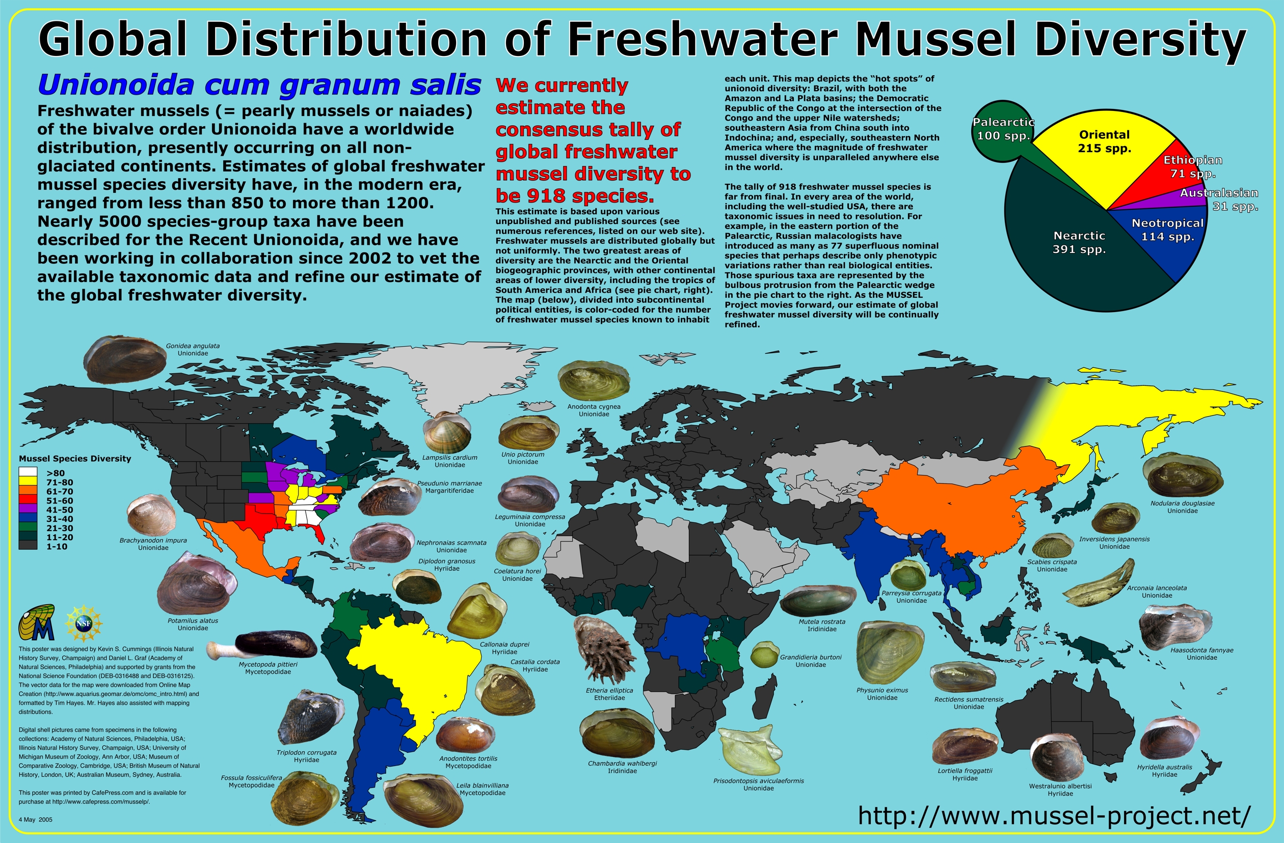 Abstract. Freshwater mussels (= pearly mussels or naiades) of the bivalves order Unionoida have a worldwide distribution, presently occurring on all non-glaciated continents. Estimates of global freshwater mussel species diversity have, in the modern era, ranged from less than 850 to more than 1200. Our census, to-date, suggests that the actual number is closer around 900 extant (or recently extinct) species, many with multiple recognized subspecies. Nearly 5000 species-group taxa have been described for the Recent Unionoida, and we have been working in collaboration since 2002 to vet the available taxonomic data and refine our estimate of the global freshwater diversity. While the order Unionoida is worldwide in distribution, the numerous individual species are not. On a global scale, most freshwater mussel species are restricted to relatively few adjacent drainage basins, and almost none have ranges across continental boundaries. Nor are freshwater mussel species randomly distributed. Certain regions are apparent 'hot spots' of freshwater mussel diversity, most notably the southeastern United States and southeast Asia. To illustrate the global distribution of freshwater mussel species, we have surveyed the literature and museum collections to determine individual species ranges. These are depicted on a color-coded map of the world showing the number of species present in each country. This map is available on the MUSSEL Project Web Site (http://clade.acnatsci.org/mussel/).