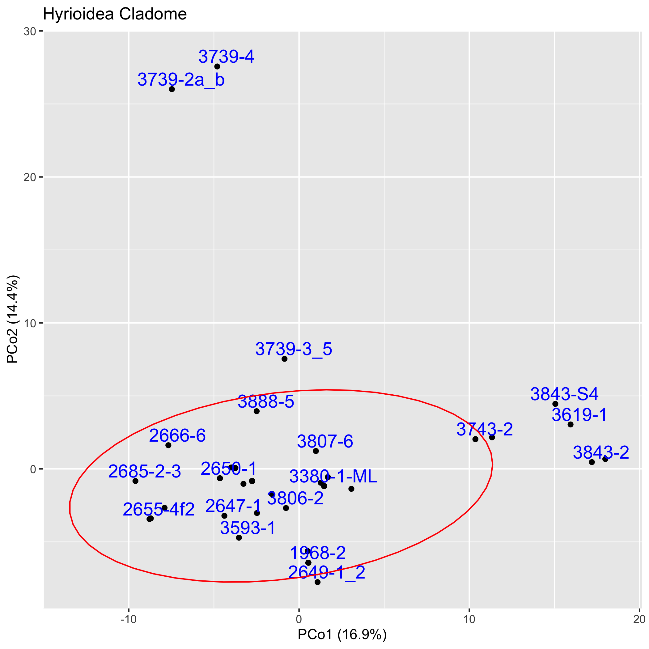 The graphs below depict in two dimensions all pair-wise ingroup distances within the cladome. See the Cladmoics FARQ for more information.