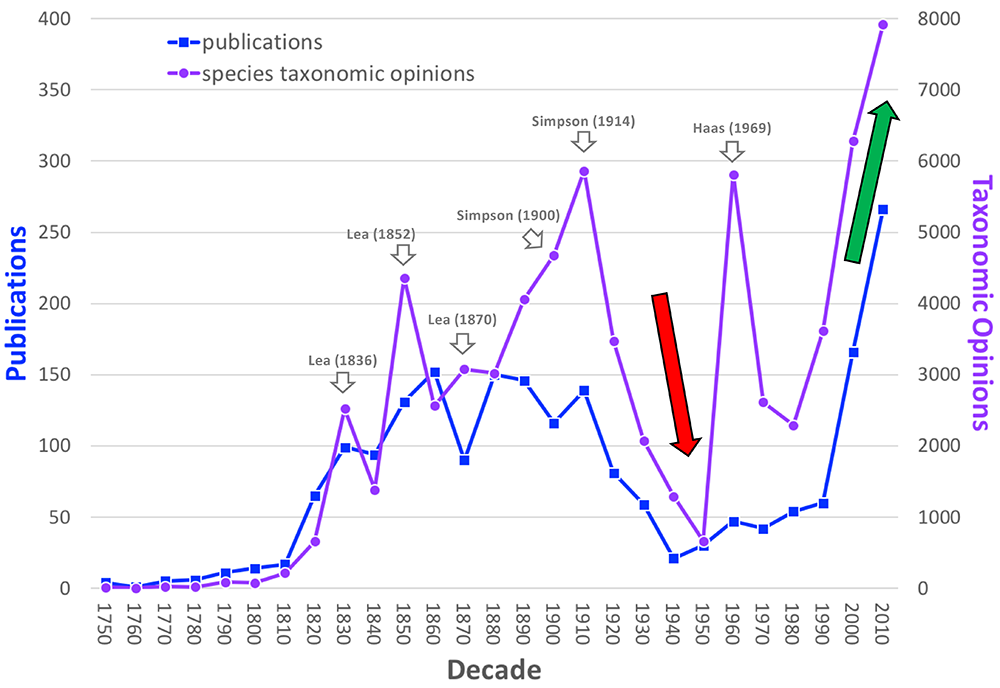 The chart shows the number of publications and taxonomic opinions in the MUSSELpdb by decade since 1750. The big red downward arrow corresponds to a lull in freshwater mussel taxonomic work after World War II. The big green upward arrow indicates exponential increase in publications and taxonomic opinions in our dataset from more recent years.