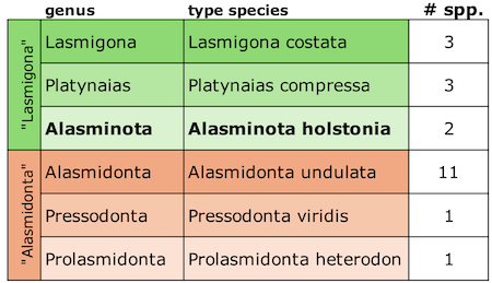 The genus Alasminota represents a shard of the shattered taxonomic bowls that contained the pre-cladistic concepts of Lasmigona and Alasmidonta. If you aren’t deep in the weeds of the cladistic and taxonomic literature, you might not have even noticed that Lasmigona and Alasmidonta weren’t as good as they have been since the late 20th century (e.g., Williams et al., 1993).