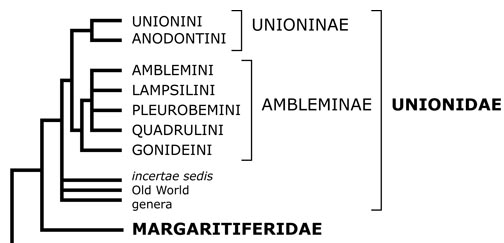 The following classification of the Unionoida is the one that we use on this website. Within the Unionidae, certain geographical assemblages in Mesoamerica, Europe, SW Asia, SE Asia and Africa cannot be placed with the same degree of certainty possible for Nearctic genera. Further, we also have included some informal group names for clades/lineages lacking formal names (i.e., the Amblemini Tribe Group, the Hyriini Tribe Group and the lasidium-bearing freshwater mussels). The classification is simply too dense to add more ranks.